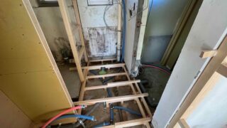 団地のリフォーム工事が開始されました。工事中の様子を一気に公開します。玄関と洗面所の入り口周りです。洗面所には新たにドアを設置します。洗面所です。トイレと洗面所ですね。上の撮影時期より前なので、床の枠組みがないですね。浴室天井ですが、上階の...